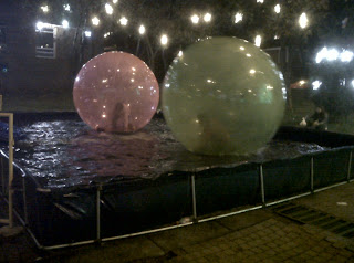 I have never seen anything like this before so I thought this was amazing. You go into those balls and just float around the pool. Has anyone seen this before? You can see the kids in there trying to stand, but they ultimately fall on their faces.